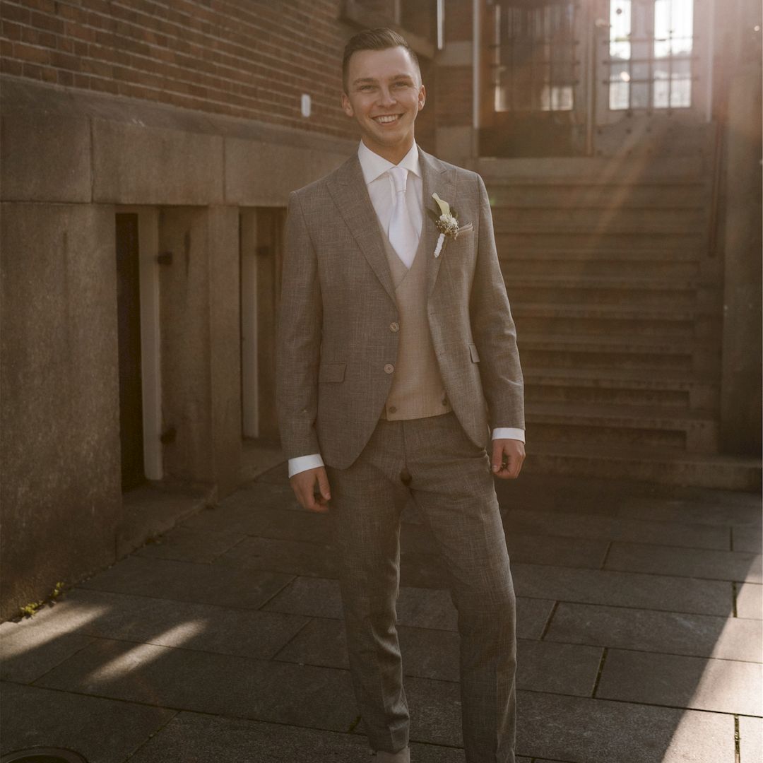 Het trouwpak dat Corné koos voor zijn trouwdag is van TS-Tailormade. Een eigentijds trouwpak op maat is helemaal van nu. Zelf je trouwpak ontwerpen? Met TS-Tailormade hebben wij een label ontwikkeld waarbij al jouw wensen mogelijk zijn. Je kunt kiezen uit een keur aan stoffen uit de tailormade-collectie. Hoe exclusief wil je het hebben? En alle details aan het kostuum? Ook die bepaal je zélf!