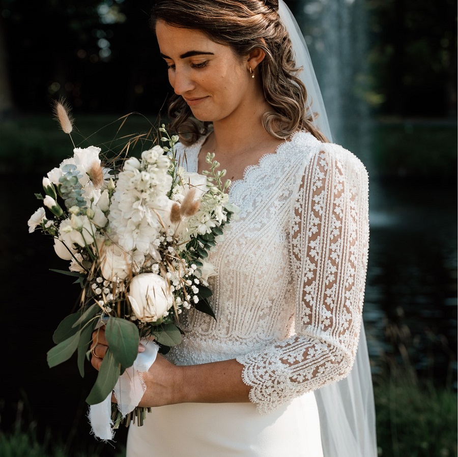 De trouwjurk die Marthy-Anne koos voor haar trouwdag is van Rosa Clará. Rosa Clara is één van de toonaangevende merken in de wereld van de bruidsjurken, het Spaanse bruidsmodemerk is te omschrijven als romantisch, elegant en een tikkeltje eigenwijs. Ze staan bekend om hun stijlvolle smaak op het gebied van kant, verfijnde stoffen en hun oog voor design. Wist je dat onder het merk Rosa Clara ook de jurken van Alma Novia en Martha Blanc vallen? Kortom! Rosa Clara heeft alles in huis om jouw als bride to be te laten stralen.