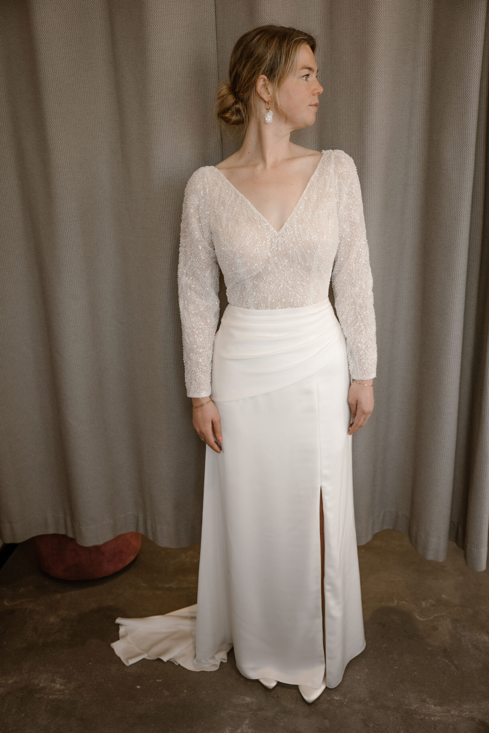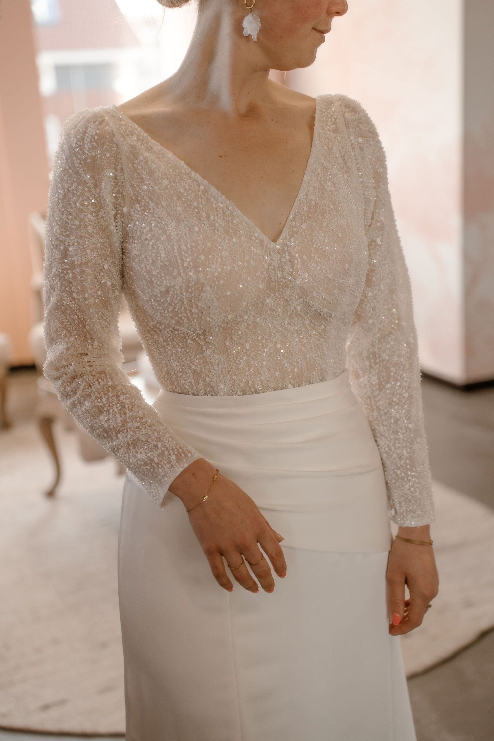 Model Dreaming of You een prachtige jurk uit de collectie van Marylise, een top gemaakt van subtiel glitterkant met kralen aangevuld met een waanzinnige aansluitende rok van satijn. Als opvallend detail heeft deze rok een fijne drapering over de taille en een subtiele split richting de knie. De bijpassende v-hals en lange mouwen maken dit plaatje compleet!