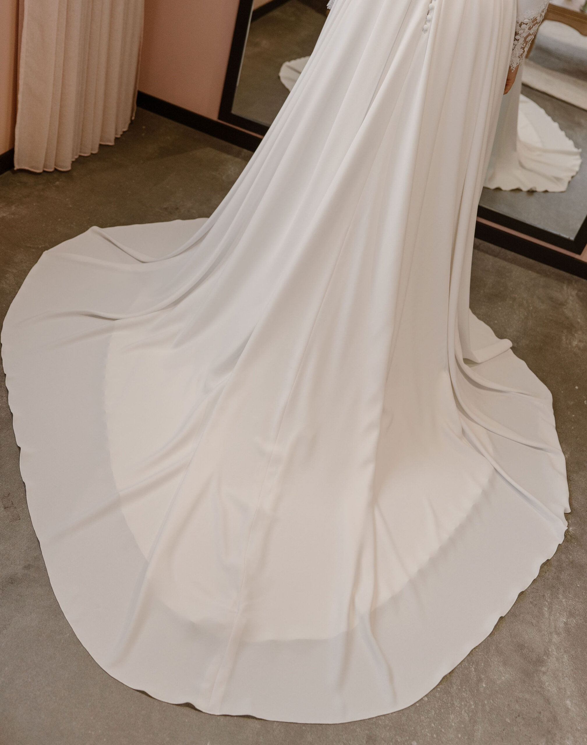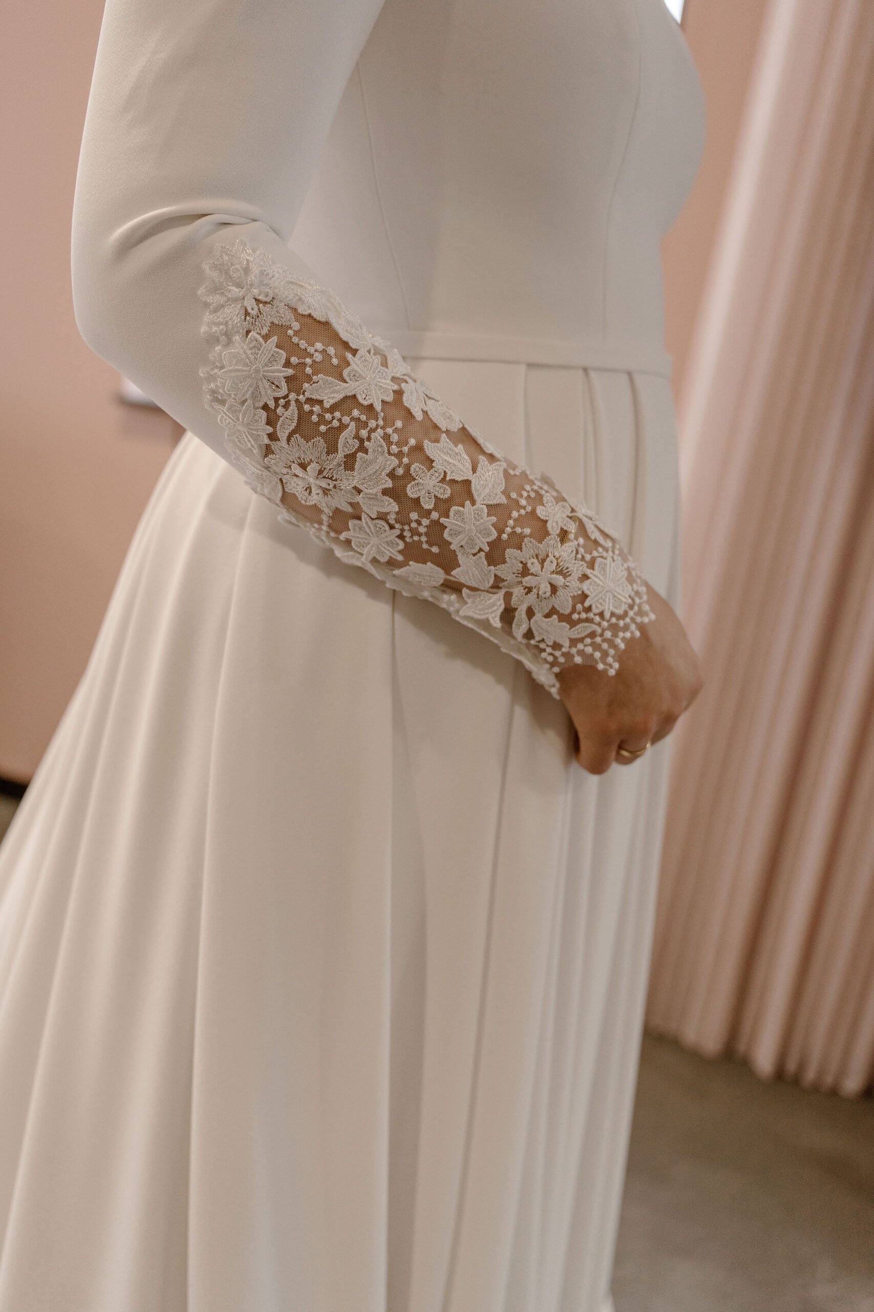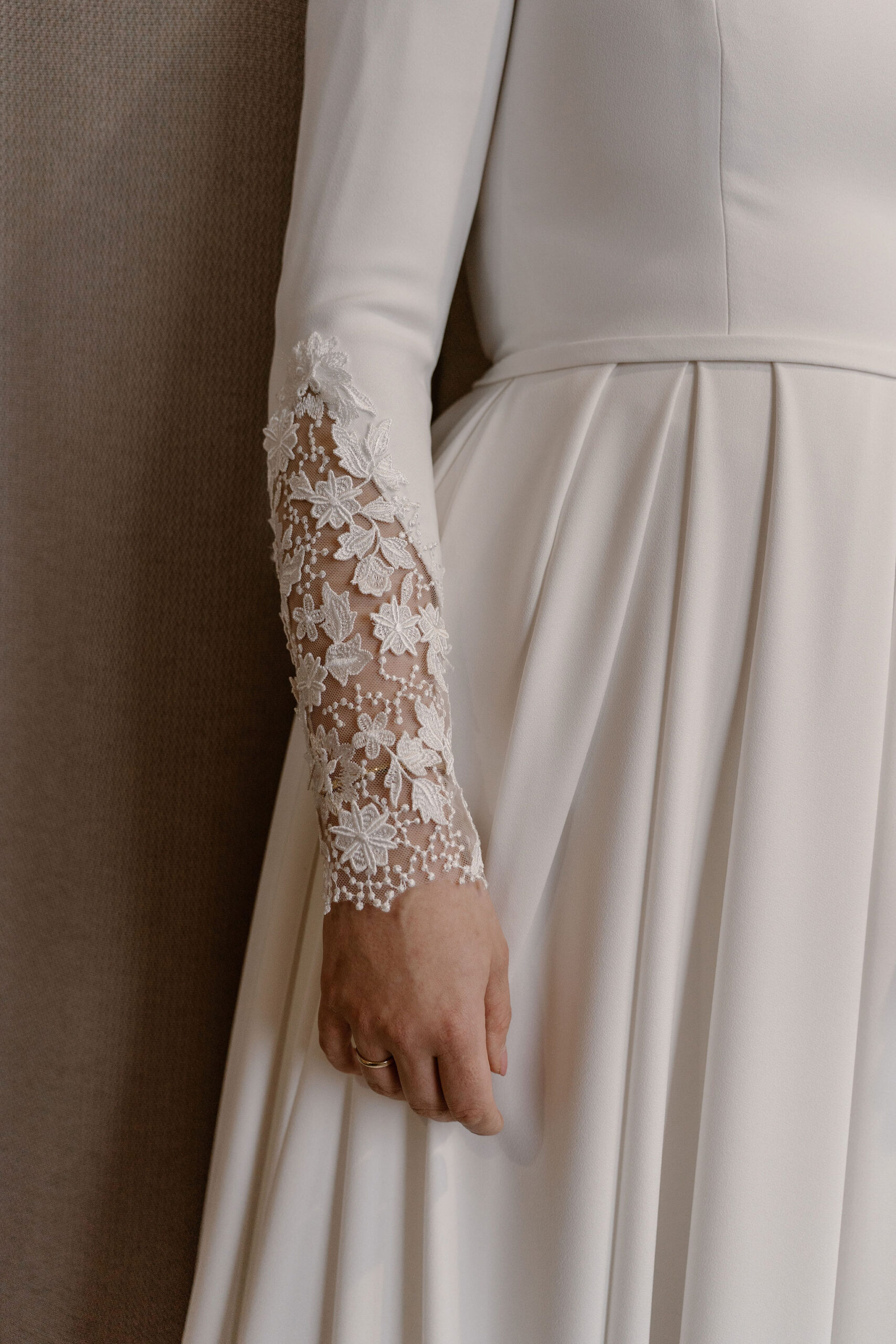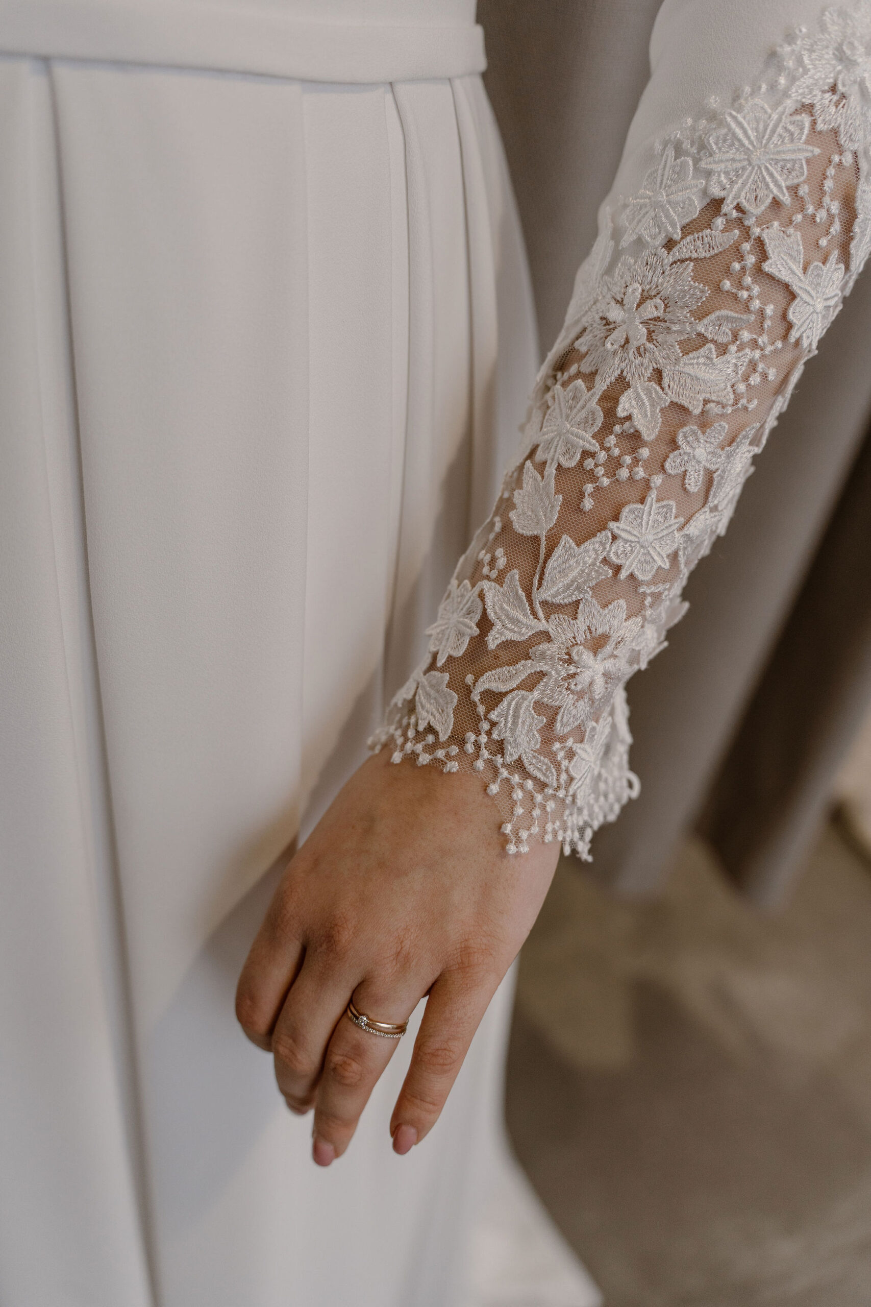 De lange mouwen zijn afgewerkt met een bijzonder kanten detail dat subtiel uitloopt in een punt. Een smalle crêpe band in de taille accentueert het silhouet, terwijl de soepelvallende rok zorgt voor een comfortabele en elegante pasvorm.