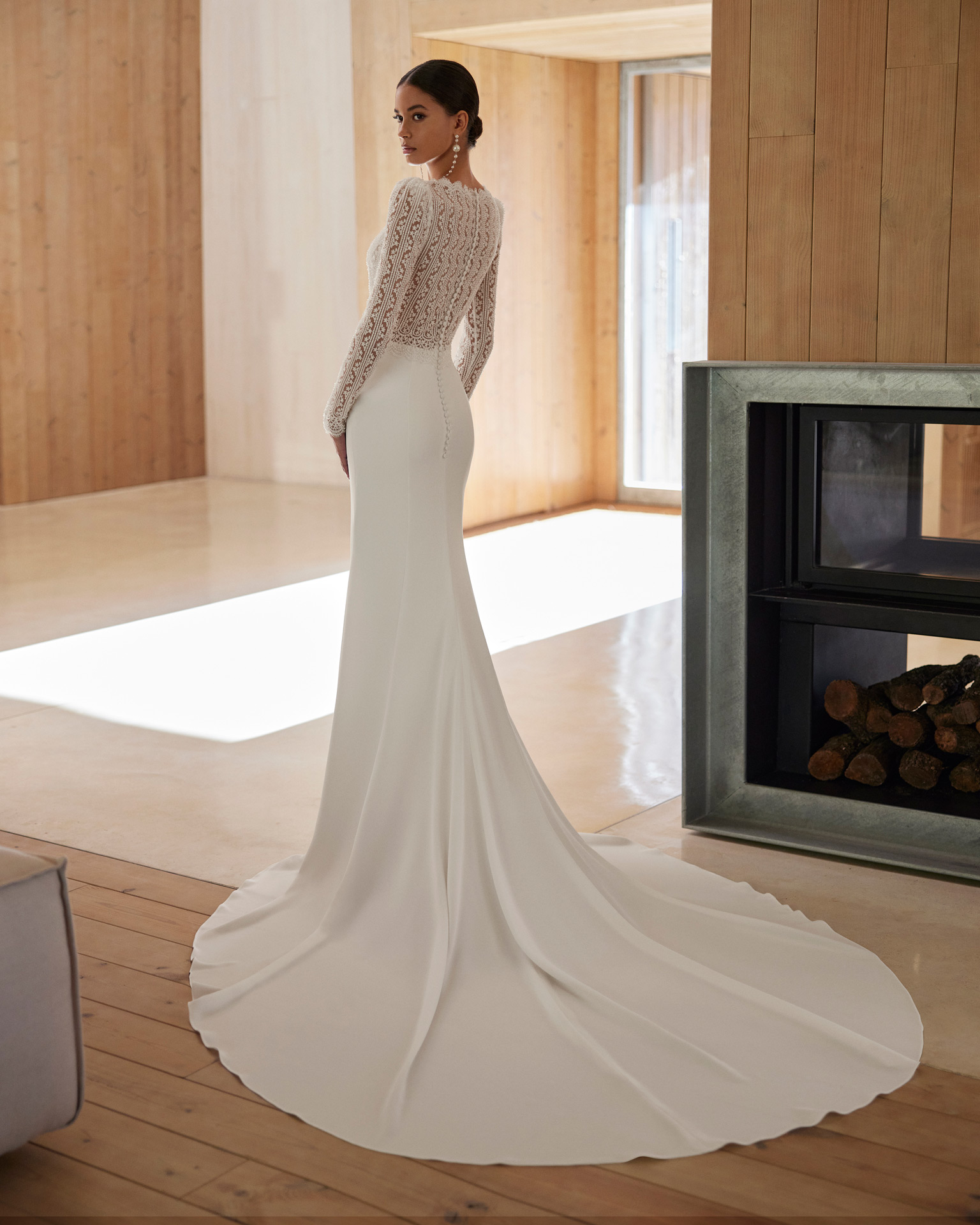 Aiden straalt moderne verfijning uit met een strak lijfje en een elegante V-hals. De soepelvallende rok beweegt licht en vrij, ideaal voor een zorgeloze ceremonie. Subtiele kantaccenten geven de jurk een tijdloos romantische touch. Perfect voor de bruid die minimalisme en elegantie wil combineren.