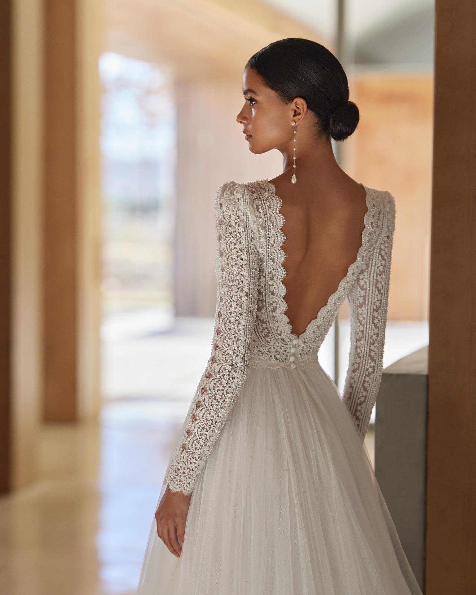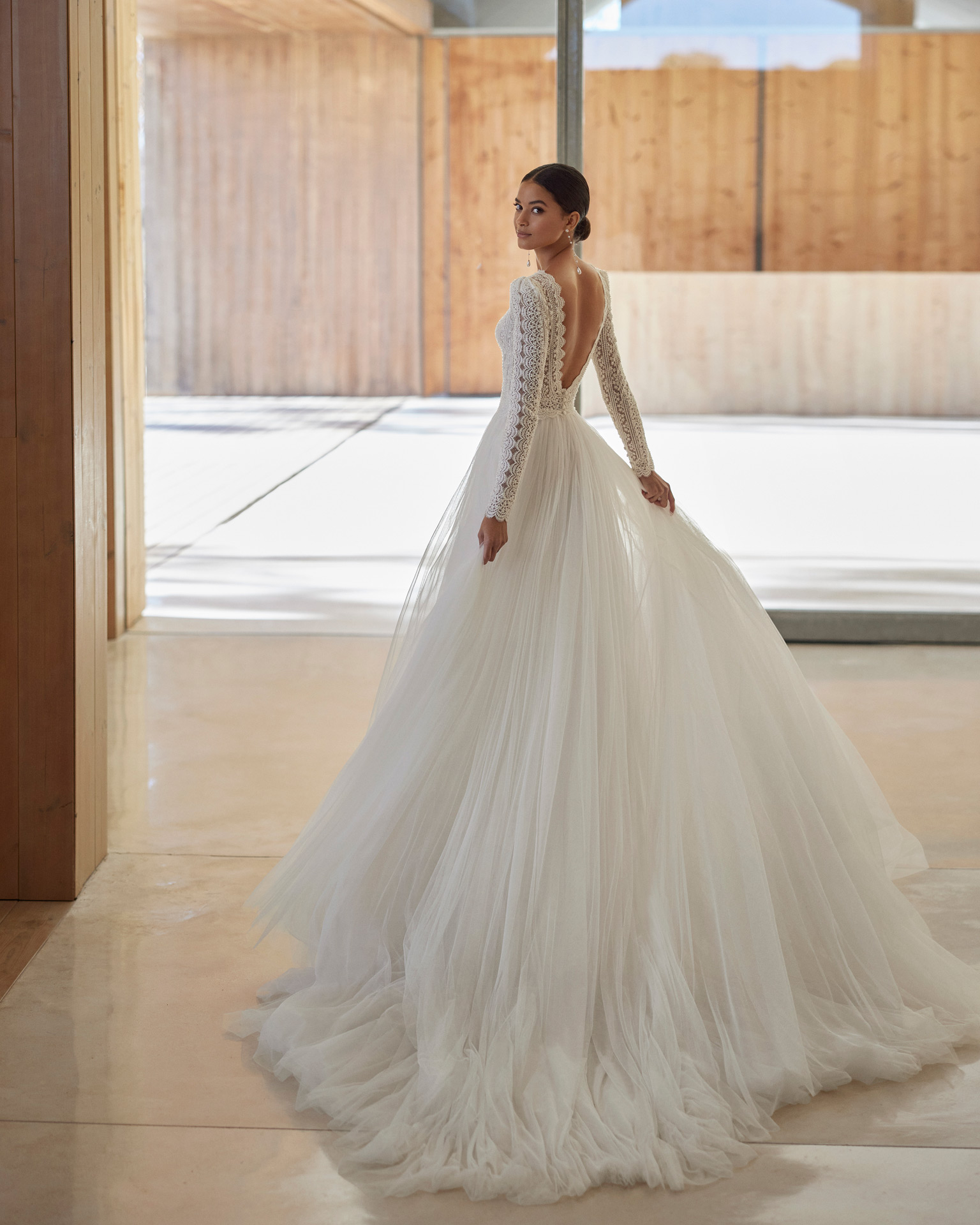 Amani is een romantische droom in kant en tule, met een zacht aansluitend lijfje dat elegant overgaat in een licht uitlopende rok. De delicate kanten details en de open rug zorgen voor een verfijnde, vrouwelijke uitstraling. Deze jurk combineert tijdloze elegantie met een subtiel speels accent, perfect voor je grote dag.