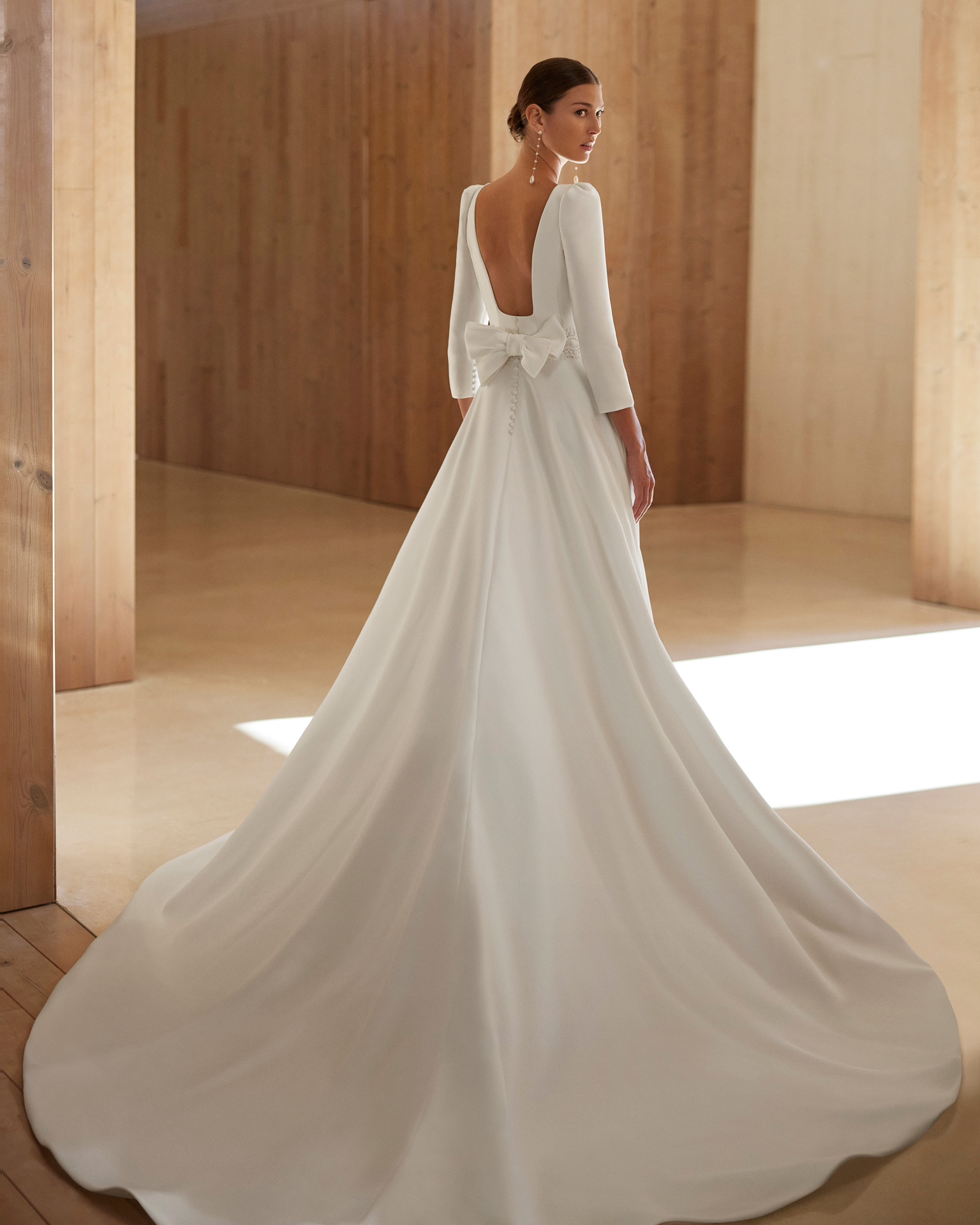 Arald is een A-lijn jurk in een tijdloos, klassiek silhouet. De jurk is vervaardigd uit luxe Sienna-stof, gecombineerd met fijn kant en subtiele strass-besatzingen voor een sprankelend accent. De jurk heeft een vierkante halslijn, driekwartmouwen en een open rug, wat zorgt voor een geraffineerd evenwicht tussen ingetogen bescheidenheid en vrouwelijke allure. Achterop valt een decoratieve strik op, wat de jurk extra charme geeft, terwijl de rok een subtiele split aan de zijkant heeft voor een elegante nonchalance.