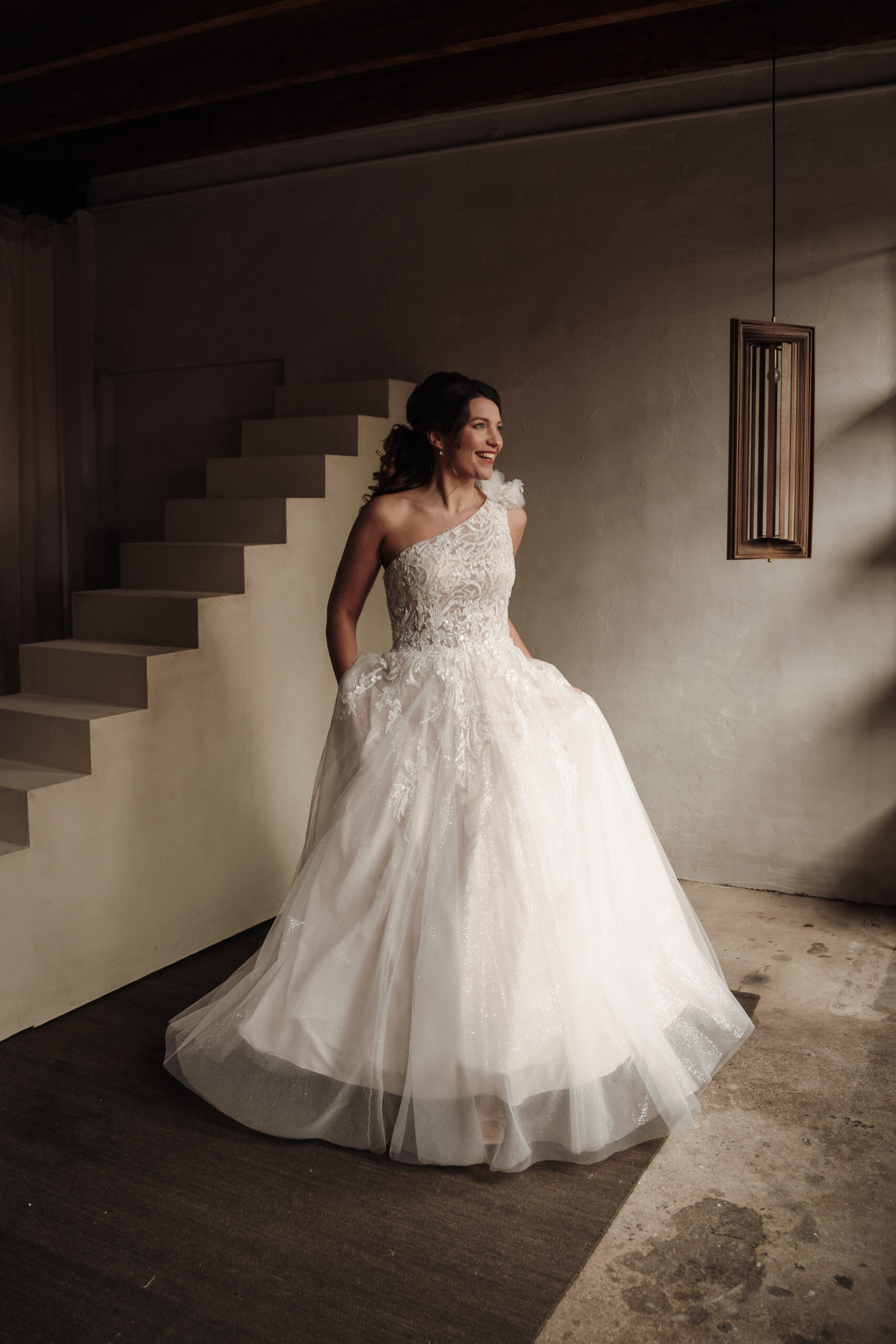Fantasy is een betoverende A-lijn trouwjurk die glamour en verfijning uitstraalt. De asymmetrische halslijn met een enkel schouderbandje versierd met een tule bloem voegt een moderne twist toe. Het lijfje is gedecoreerd met kant en kraaltjes, terwijl de glittertule rok zorgt voor een sprankelende uitstraling. Voor de bruid die wil stralen met een eigentijdse en verfijnde look.