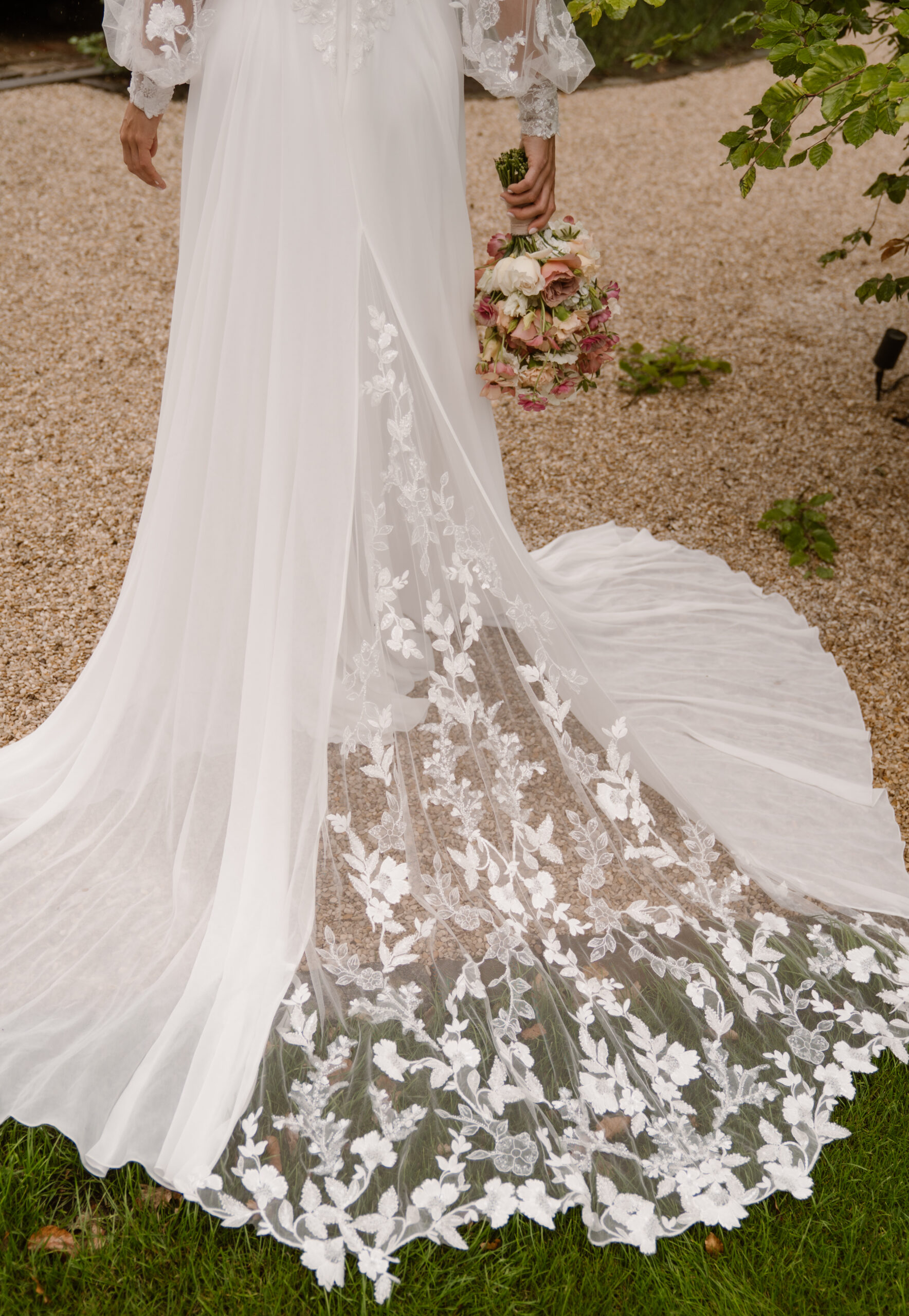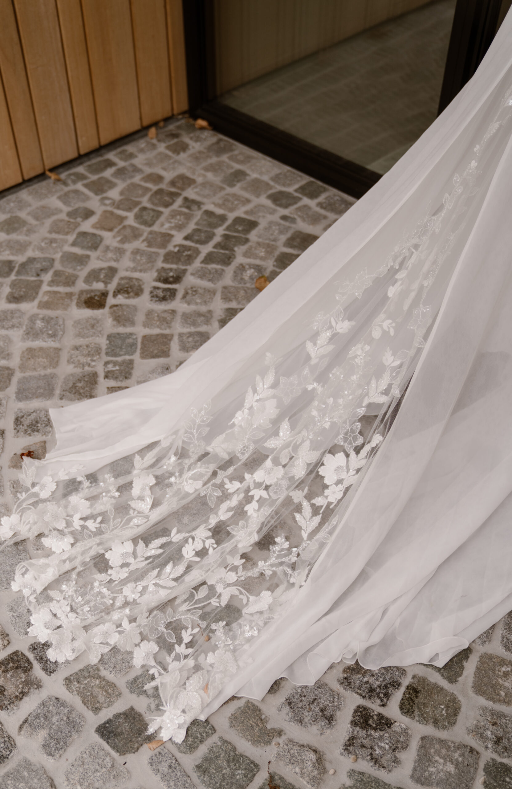 De Hemilly trouwjurk straalt romantiek en verfijning uit. De kanten top met hoge halslijn is versierd met bloemrijk kant en delicate beading voor een subtiele sparkle. Afneembare lange mouwen geven je de vrijheid om je look aan te passen. De soepelvallende A-lijn rok van chiffon beweegt elegant met je mee, terwijl een kanten detail in de sleep zorgt voor een verrassend en sierlijk accent.