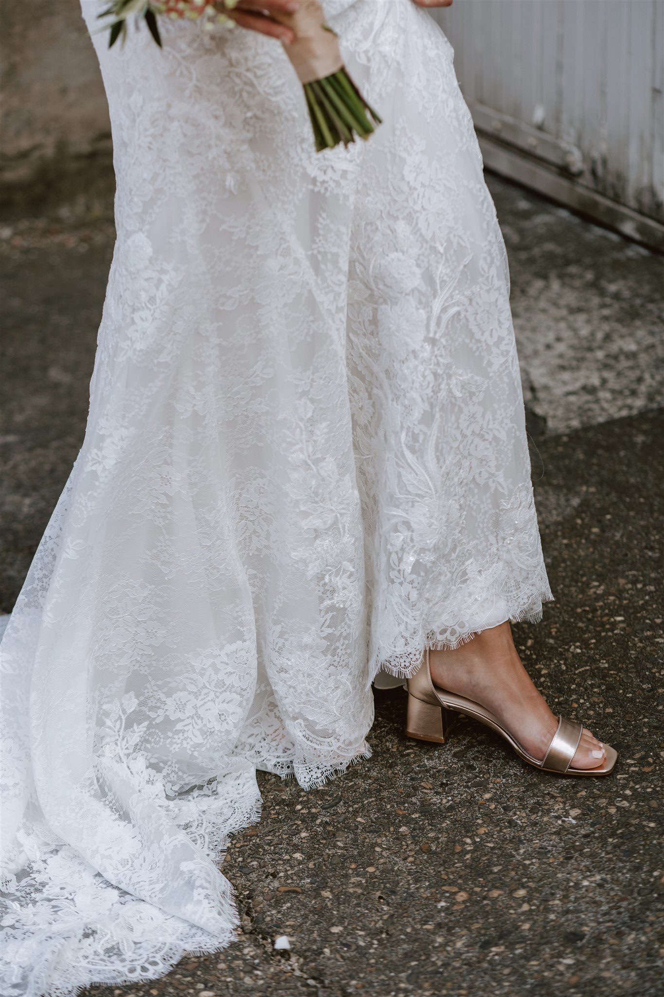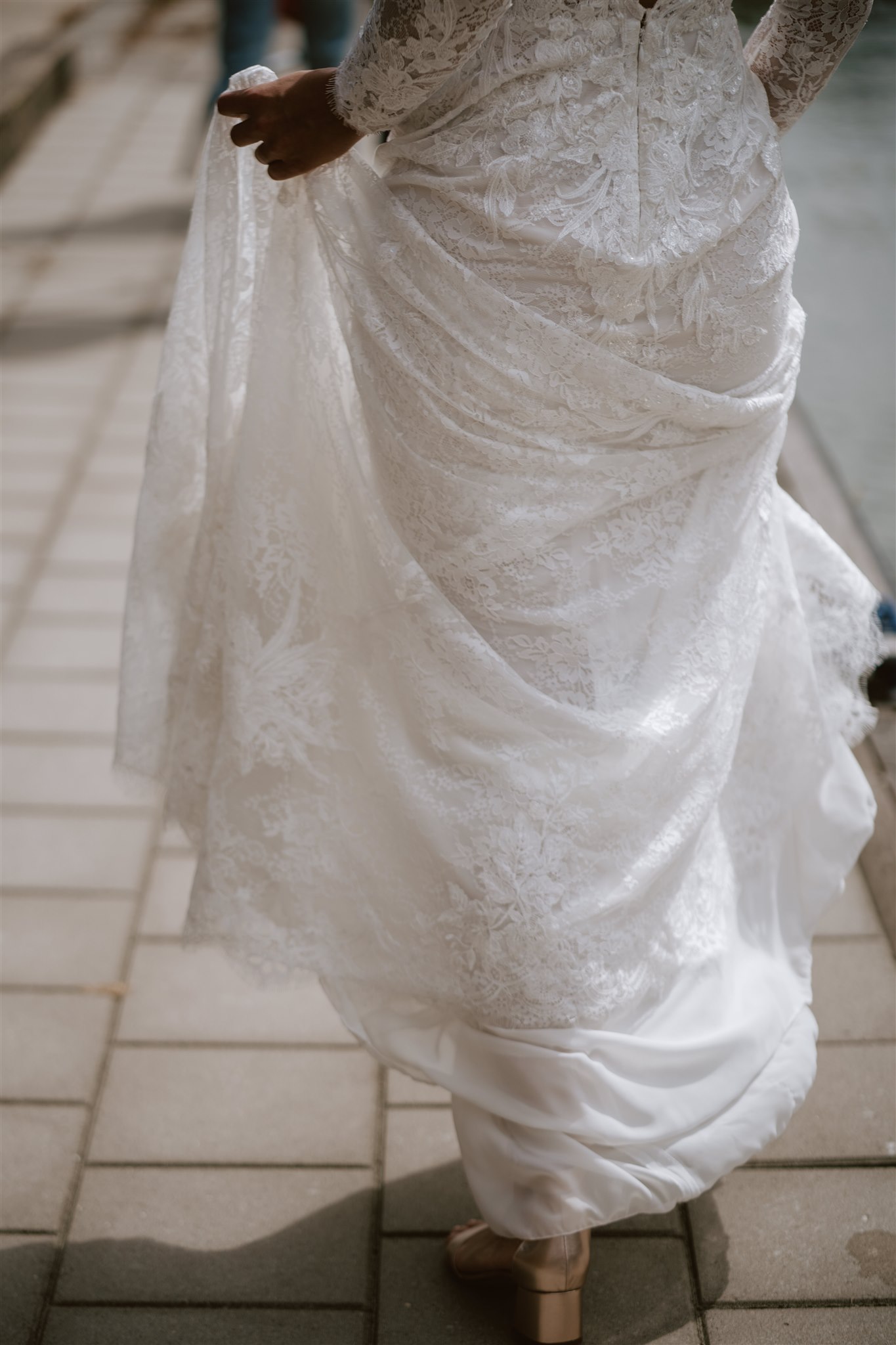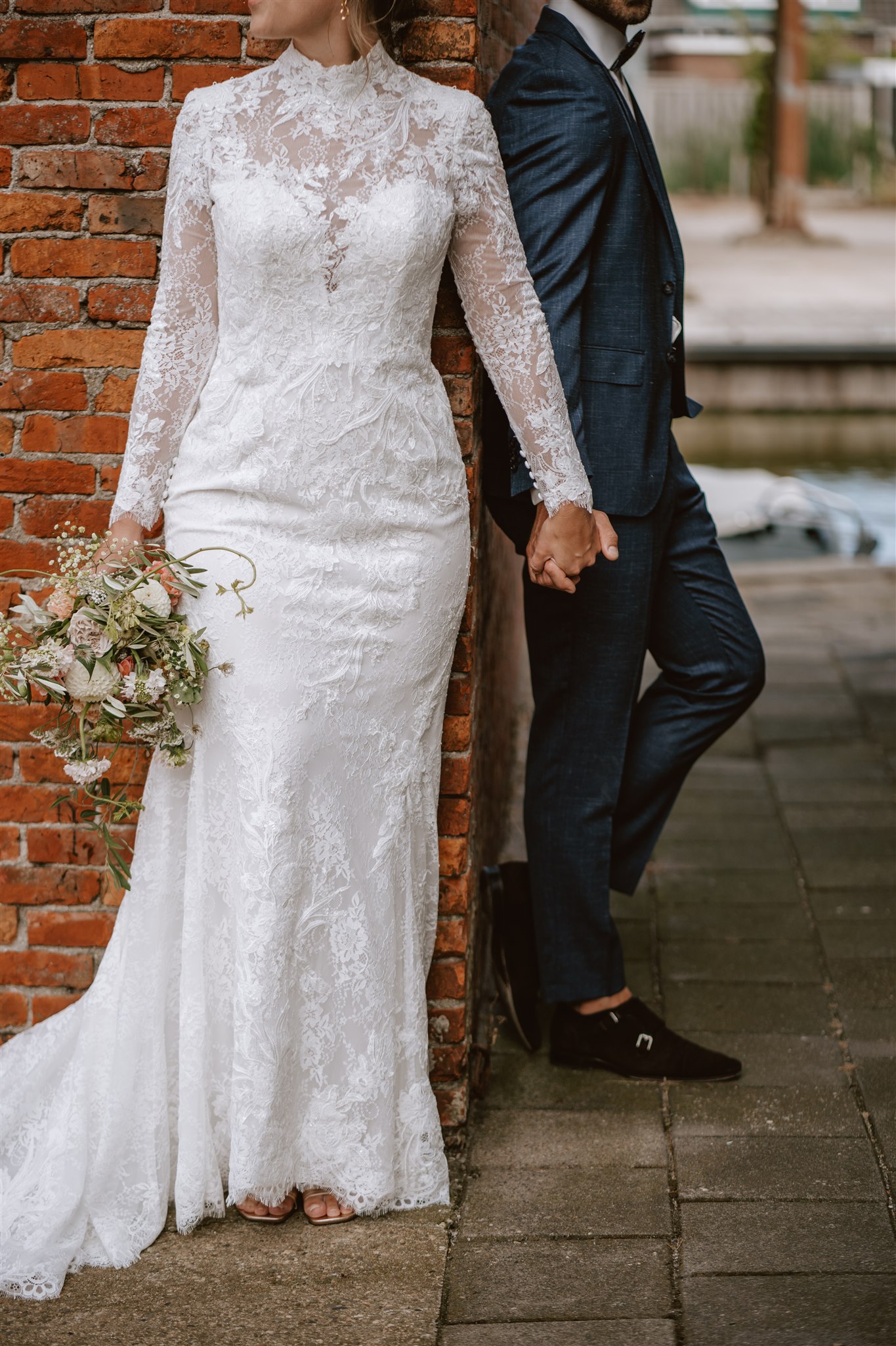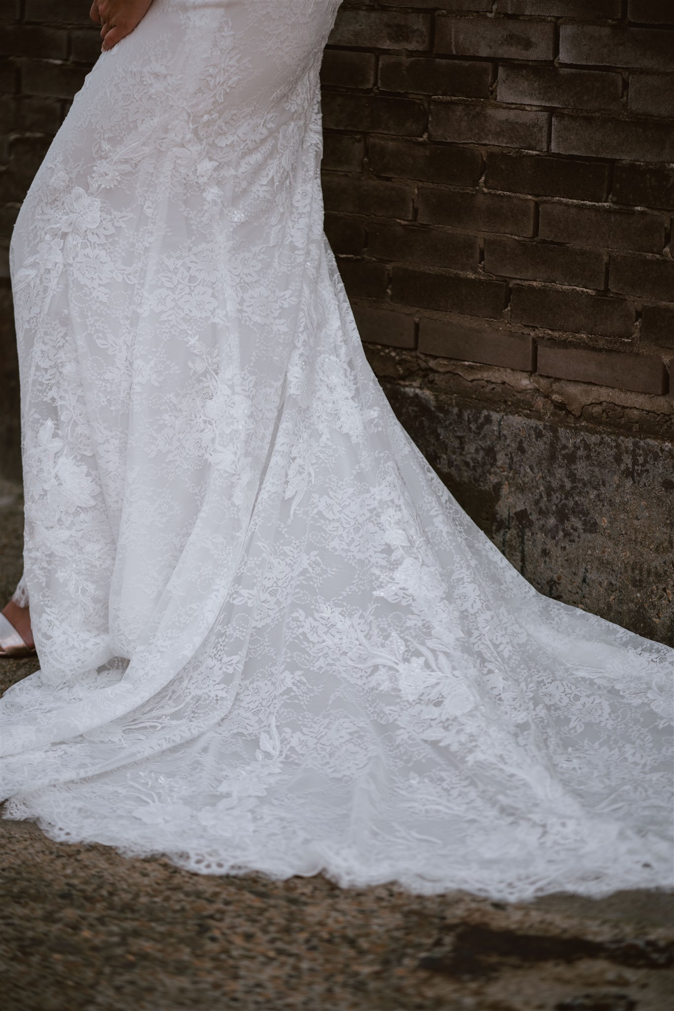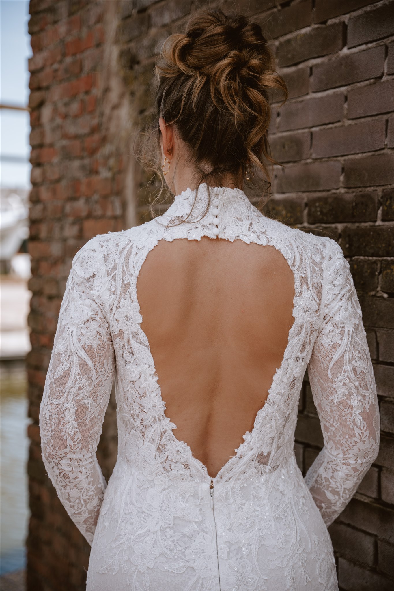 Leith is een verfijnde mermaid trouwjurk met een hoge halslijn en lange mouwen van kant. Het luxe kantmateriaal en de lange mouwen geven de jurk een klassieke uitstraling, terwijl de strakke pasvorm de vrouwelijke vormen benadrukt. Deze jurk is ideaal voor bruiden die op zoek zijn naar een elegante en tijdloze look.