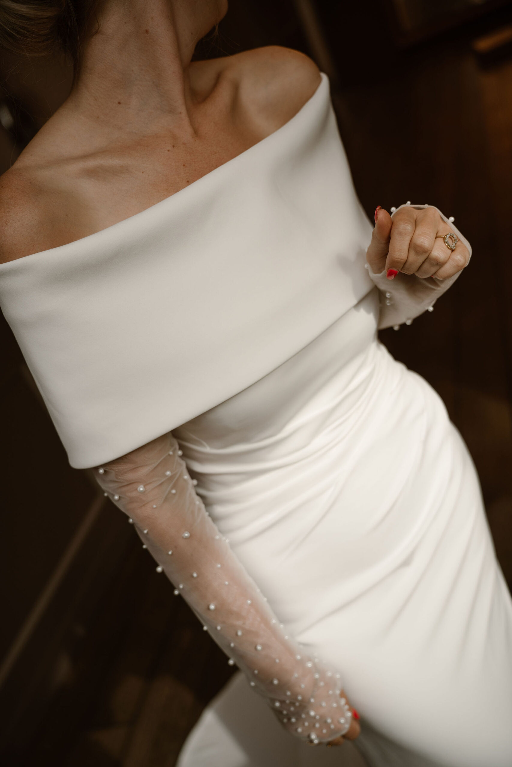 Odette is een verfijnde fit-and-flare trouwjurk die moeiteloos romantiek en moderniteit combineert. Het lijfje is strak en zacht gerimpeld, terwijl de rok elegant uitloopt in een mermaidstijl. De afneembare chiffon sjaal voegt een dramatisch element toe en kan gedragen worden als een moderne sluier. Deze jurk is ideaal voor bruiden die op zoek zijn naar een minimalistische, doch gedurfde look op hun speciale dag.