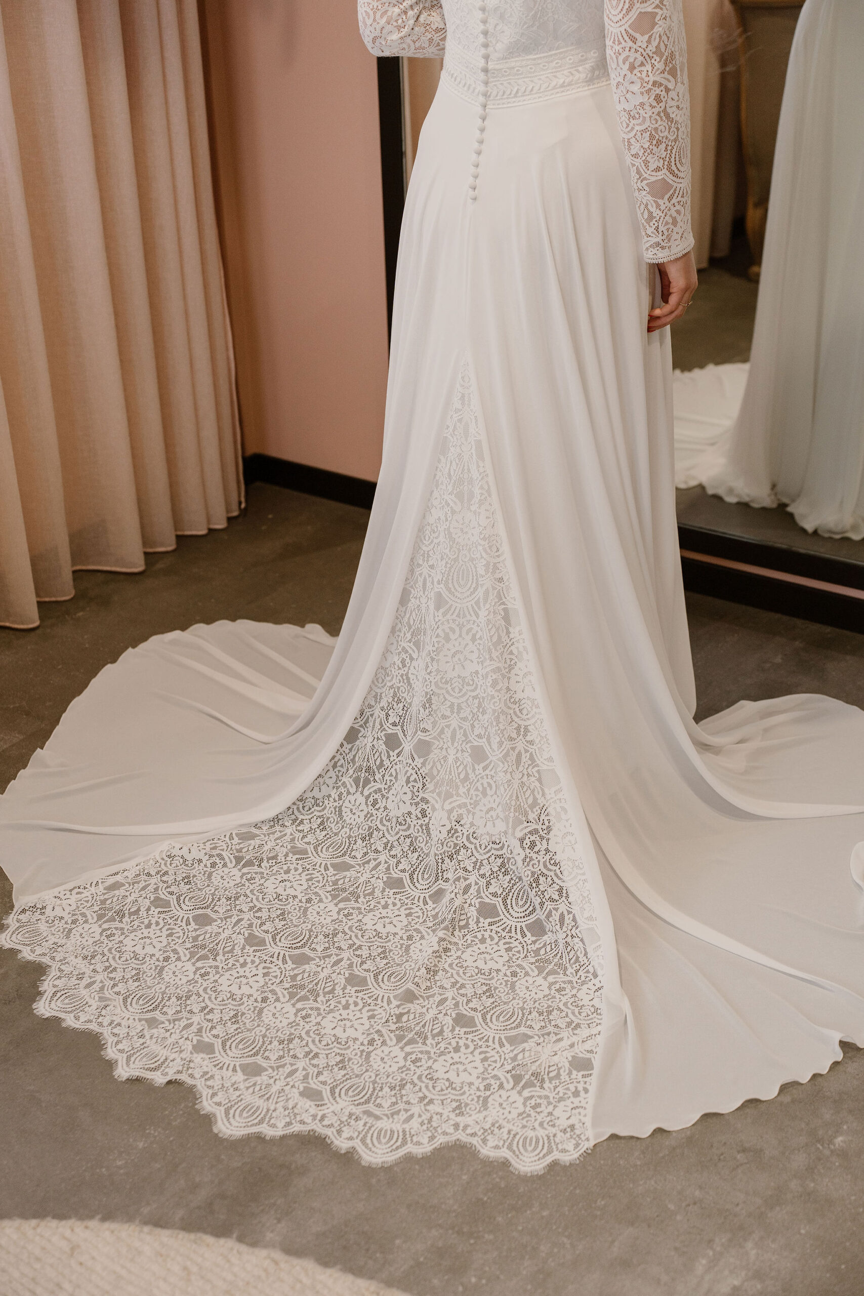Deze bijzondere jurk is ontstaan uit een samenwerking tussen het atelier van Marylise en Atelier Speksnijder, waardoor hij perfect aansluit bij de stijl en wensen van onze bruiden.