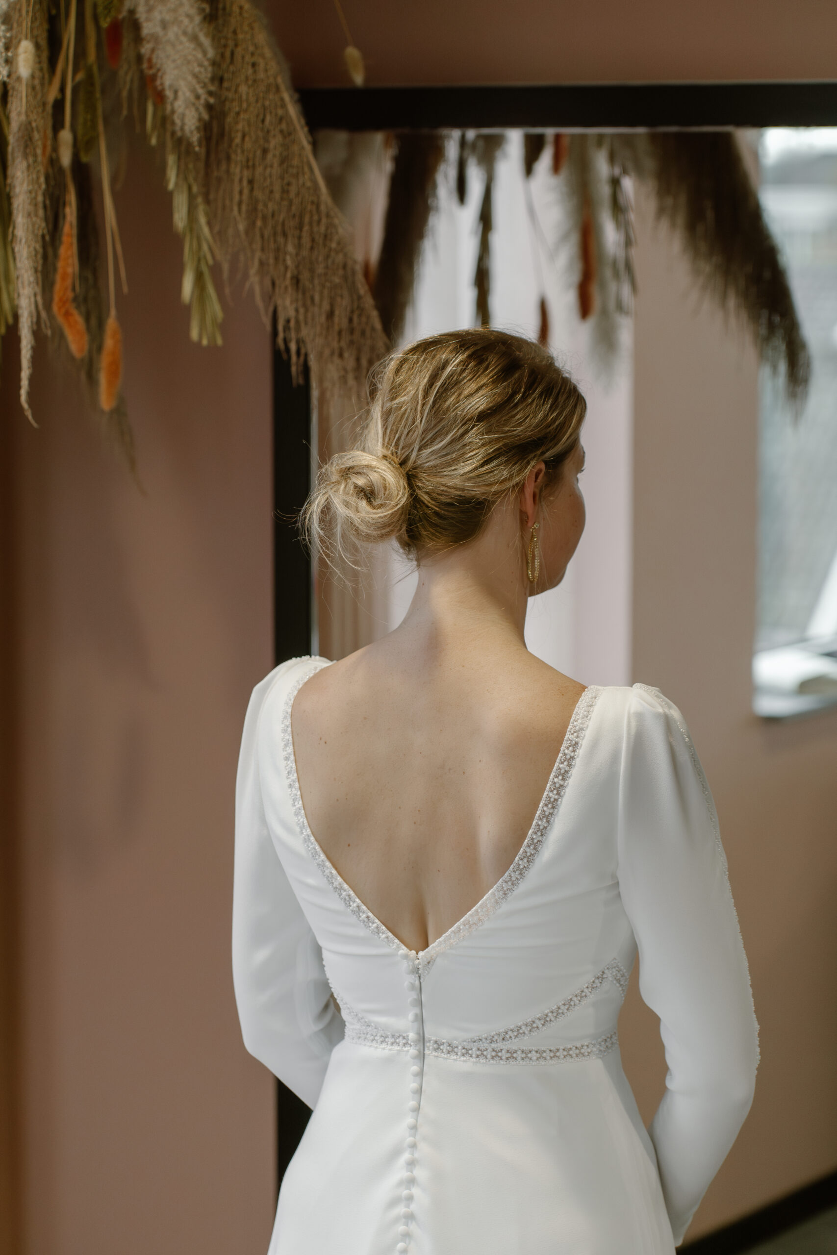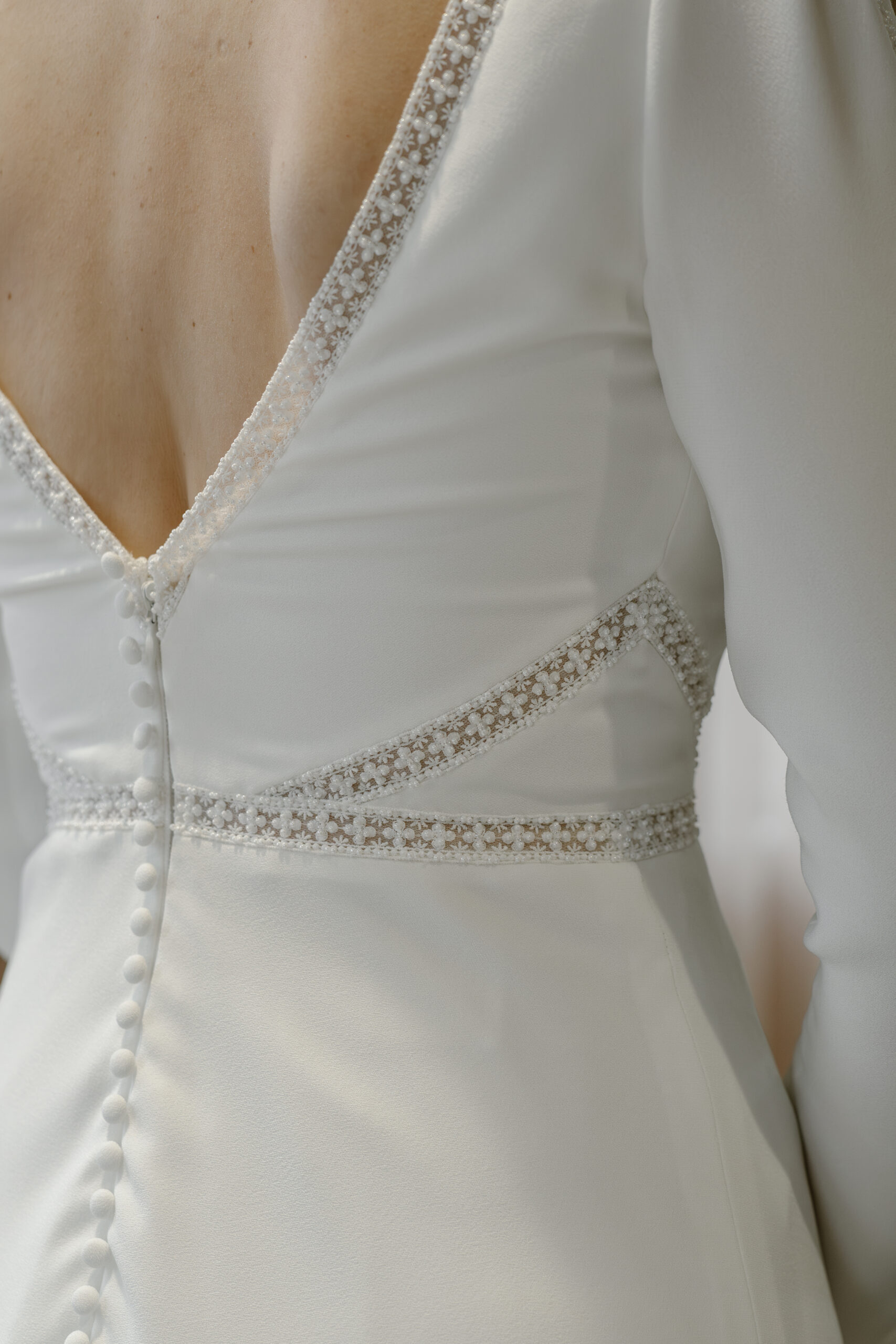 Ubeth combineert moderne elegantie met romantische details. Het column-silhouet volgt subtiel je figuur, terwijl de zachte crêpe soepel valt. Lange, doorschijnende mouwen en een open rug met sierknopen geven een verfijnde touch. De lichte sleep zorgt voor elegante beweging bij elke stap.