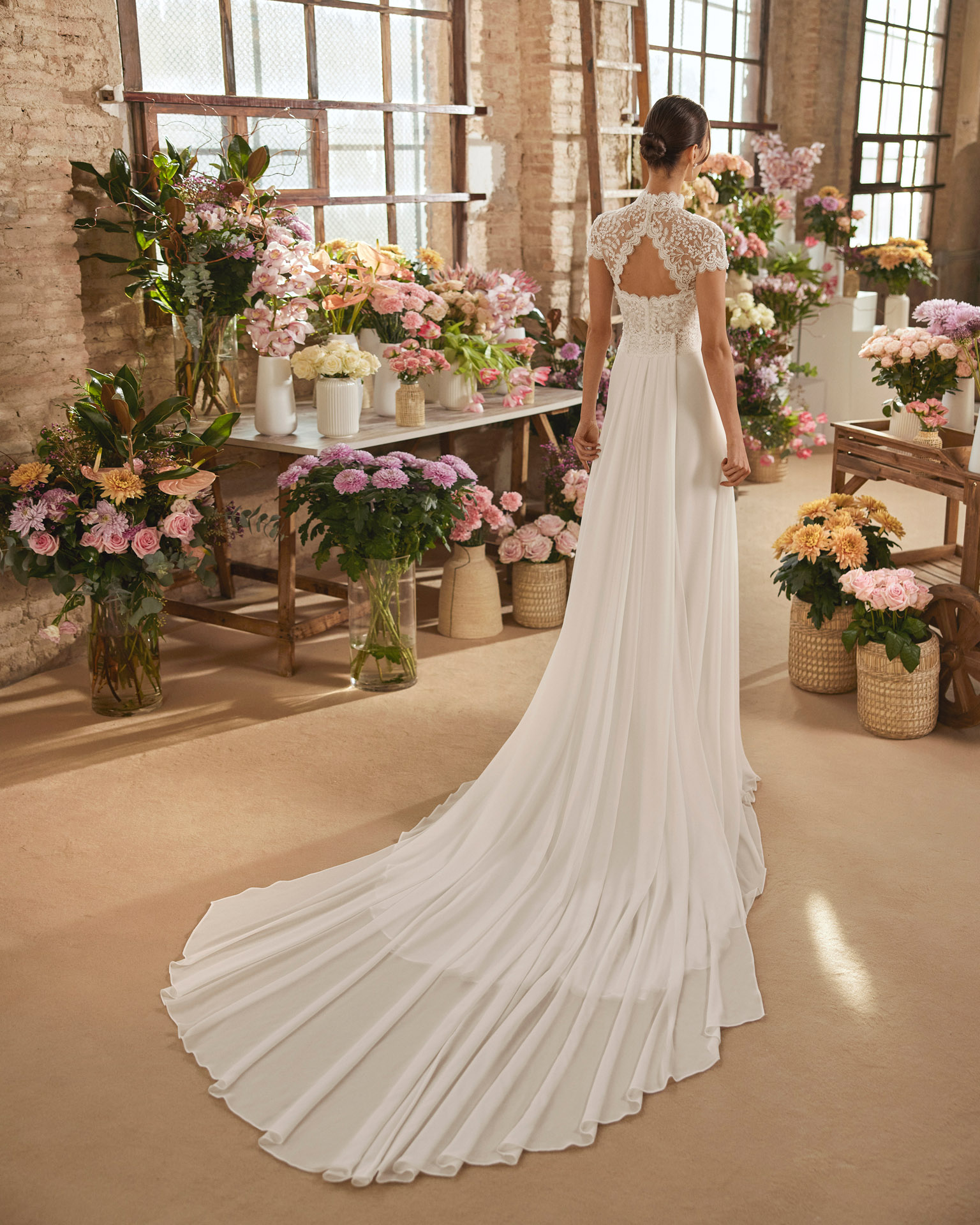 De Xelena-jurk van Rosa Clará is de belichaming van bohemian romantiek. Deze trouwjurk combineert een verfijnd kanten lijfje met een elegante hoge neklijn, wat zorgt voor een vrouwelijke en stijlvolle uitstraling. De soepelvallende rok geeft de jurk een natuurlijke beweging en een lichte, comfortabele draagervaring – ideaal voor de bruid die zich vrij wil voelen op haar grote dag.